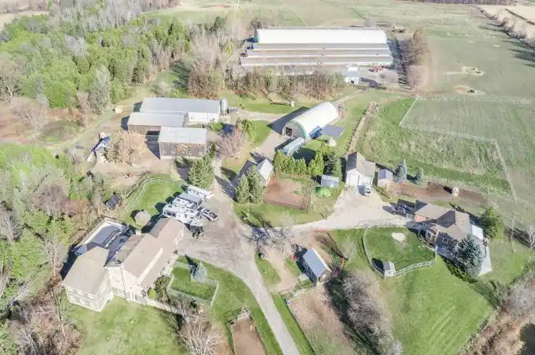 Two custom homes situated on this exceptional 118 acre property that is currently operating as a bison and Texas Longhorn cattle farm, located just minutes from the thriving town of Alliston. The main residence features a spacious eat-in kitchen with a walkout to a beautifully landscaped yard and pool. The ground level offers a family room, living room, office, and a primary bedroom, while the upper level boasts five generously sized bedrooms and a spa-like bathroom. The walkout lower level includes a large recreation room, kitchenette, and an additional bathroom. A second residence with a walkout bungalow built in 1998, provides two bedrooms on the main floor and three more on the lower level, making it ideal for multigenerational living. This impressive working farm is equipped with extensive infrastructure, including an 800-amp electrical service and a 10kW microFIT solar panel system that generates approximately $10,000 annually. There are six expansive grazing sheds, each measuring 32ft by 360ft, along with a 130ft by 50ft shop that features approximately 40 percent cold storage, which is attached to a 50ft by 80ft building offering roughly 90 percent cold storage. The beautiful bank barn includes two upper levels, thoughtfully designed for retail use and has potential living quarters, with the lower level set up for horses. Additional facilities include a 40ft by 100ft coverall building and several single-stall run-in sheds. Approximately 80 acres are workable, with a portion currently dedicated to pasture.