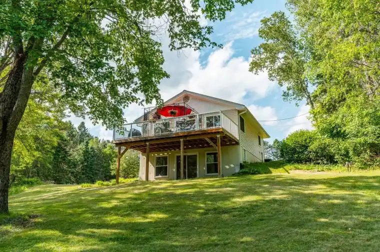 Escape to this serene waterfront property on the Gull River, offering access to Maple, Grass, and Pine Lakes. A true haven for nature lovers and boating enthusiasts. This well-maintained total 2510 sf, 2-bedroom, 3-bathroom home is situated on a year-round municipal road and offers everything you need for comfortable four-season living. Step inside to a spacious great room featuring rich oak kitchen cabinetry, sleek black appliances, and a large central island. The open concept living and dining areas walk out to a generous deck with stunning views of the river, your private dock, and the peaceful surroundings. The main level is complete with a spacious primary bedroom, with a 2-piece ensuite and river views, a second bedroom, a modern 3-piece bath with convenient laundry facilities and a bright, welcoming foyer. Downstairs, a fully finished walk-out lower level includes a large recreation room, a 2-piece bathroom, a utility/workshop area, and a large storage room with exterior access, ideal for stowing outdoor gear or potential to be converted into extra living space! Outside, enjoy a gently sloping lot leading to the waters edge, perfect for swimming, paddling, or a leisurely boat ride to explore the interconnected lakes. Relax on the patio, soak in the tranquility, and embrace the best of country living. Additional features include forced-air propane heating (less than a year old), central air conditioning, R/O water treatment and high-speed internet. Also features a spacious 4-bay, insulated and heated garage, ideal for a year-round workshop, boat storage, and all your recreational toys. Situated in a prime location with Sir Sam’s Ski & Ride & Spa, and the towns of Haliburton and Minden only a few minutes away this property is a must see!