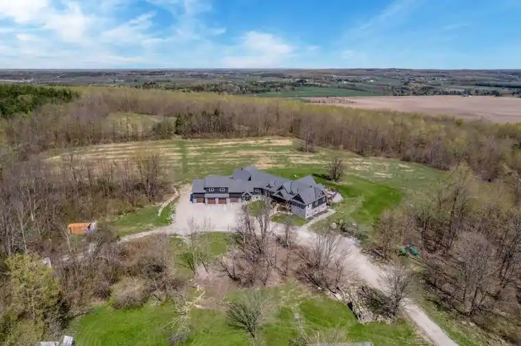 FAMILY COMPOUND – Built in 2022, this expansive 9,000 sq ft home on 100 acres is perfect for multi-gen living or rental income. The property features a custom main house, a legal ranch-style apartment w/private laundry + a loft above a heated 4-car garage. As you enter the large foyer, you’re greeted with panoramic views of the property through floor-to-ceiling windows. The main house features 3+2 bedrooms, 3 full and 2 half baths, 9′ ceilings, and engineered hardwood on the main floor. A grand living room impresses with 19′ vaulted ceilings and access to a covered deck overlooking the pool. The spacious kitchen and formal dining room are ideal for gatherings, boasting quartz countertops, a double farmhouse sink, premium stainless steel appliances and a large custom island. The primary suite offers a private retreat with deck access, dual walk-in closets, and a luxurious 5-piece ensuite featuring a soaker tub, walk-in shower, dual-sink quartz vanity, and private water closet. The expansive walk-out basement includes a recreation room, two additional bedrooms, and a salon with a powder room, perfect for a home business or studio complemented by durable vinyl plank flooring. The separate legal accessory apartment provides a modern living space with vaulted ceilings, open-concept design, quartz kitchen countertops, a private covered deck, and dedicated laundry, ideal for family or as an income opportunity. The loft features a bedroom, 4-piece bath, kitchenette, and private deck, suitable for guests or extended family. The garage boasts 4 bays with 10 and 14 ceilings, perfect for car enthusiasts or workshop space. Outside, the 100 acre property supports many activities, hiking, hobby farming, or a private nature retreat. Enjoy a private outdoor oasis w/ a heated 20′ x 40′ saltwater pool, multiple decks, and lush green space. For more details, please contact us directly.