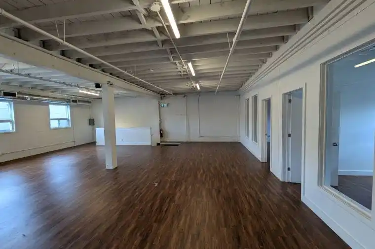 Super second floor open concept commercial retail studio with a private entrance. 10 foot ceilings & 7 new windows result in a very bright space with tons of natural light. Great layout with 2 private offices. White walls & stressed oak-like floor. New lighting, 3-piece bathroom with shower, kitchenette, & Hvac with AC. Excellent studio space ideal for marketing & tech companies. Professional ownership & management. Individual control of heating & cooling. Gas & hydro extra. See floor plan.