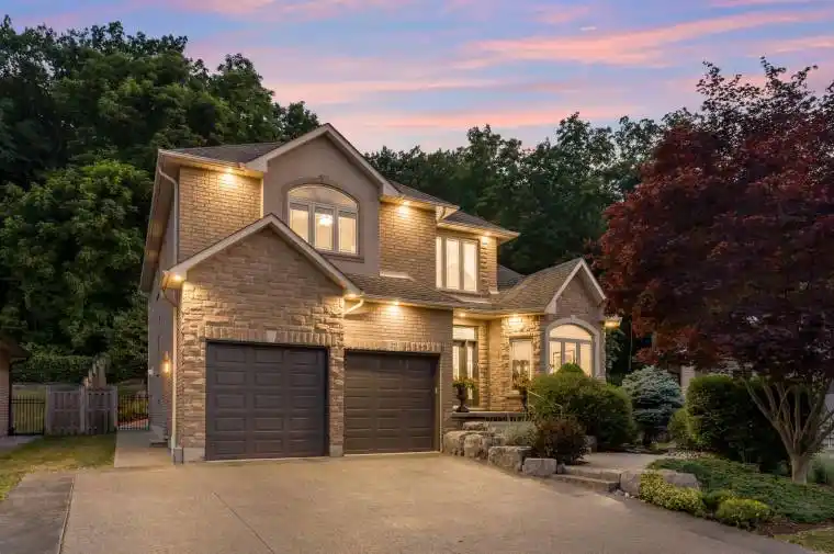 Custom built in 2003 and nestled beneath the Niagara Escarpment on a quiet crescent, this meticulously maintained 4+1 bedroom home offers breathtaking views and a tranquil, cottage-like setting. Soaring ceilings, oversized windows, and rounded corners add elegance and natural light throughout. The freshly painted interior features new kitchen appliances with gas cooktop option, all under a 5-year warranty. The spacious primary bedroom features a two-sided gas fireplace shared with the spa like ensuite creating the ultimate retreat. Walk-in closets in every bedroom, central vac, RO water at all sinks, and two fruit cellars enhance everyday living. The finished basement with 9ft ceilings, separate entrance, and roughed-in kitchen offers in-law or income potential. Step outside to a pie-shaped private lot backing onto lush green space with a multi-tiered waterfall and hot tuba true backyard oasis. The oversized exposed aggregate driveway fits 6 cars. Move-in ready and surrounded by nature, this home combines comfort, luxury, and lifestyle in one exceptional package.