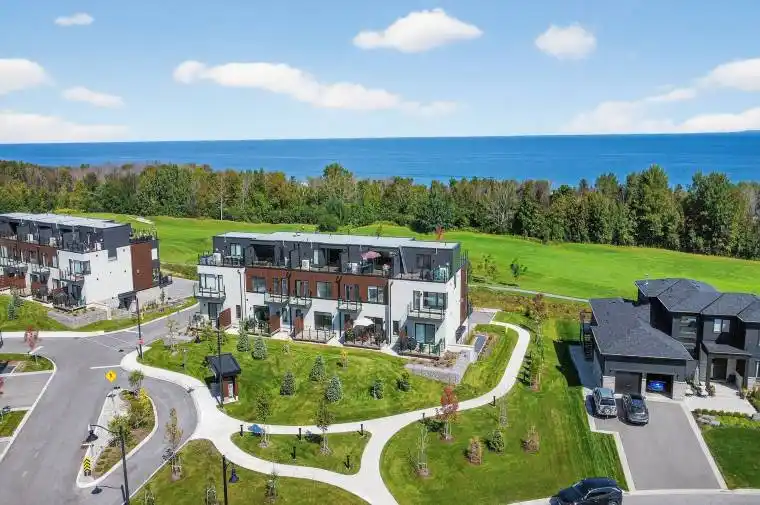 Welcome to The Sands. Immerse yourself in the four seasons splendour of Southern Georgian Bay in this brand new, luxury condo community in Lora Bay. Boasting the best views of Lora Bay golf course, Georgian Bay and the escarpment in the community, this 2 bed (potential for 3rd and 4th bedroom), 2 1/2 bath, three story condo with expansive rooftop terrace is the ideal vacation property or permanent retreat. The ground floor offers an exceptionally deep garage (room for two cars) with interior access to the stylish main entrance and flex room, currently equipped with a sauna. Travel upstairs by way of the beautiful wood and carpeted staircase or your very own private elevator. The main floor is an open concept entertainers dream with massive windows allowing tons of natural light, high ceilings and pot lights throughout. The expansive kitchen is complete with a large island, quartz counter tops, ample storage and a walk out to the south facing deck. Beside the kitchen sits the open concept dining space with room for an oversized table and completing the main floor is the beautiful living room with gas fireplace, views of the golf course and a north facing deck. Another ride up the private lift brings you to the third floor and the primary and guest bedrooms. The primary bedroom overlooks the golf course and the bay and has ample room for a king size bed. Complete with a large walk-in closet and a gorgeous 4 piece ensuite. Just outside the primary bedroom you will find the convenience of the laundry closet, and steps away sits the luxurious guest bedroom boasting a large closet and a south facing balcony. Your final trip up the lift takes you to the stunning rooftop terrace with north and south facing panoramic views. Don’t miss this opportunity to truly enjoy the Southern Georgian Bay lifestyle from this luxurious, convenient and stunning condo. **opportunity to purchase with some or all furniture**Inquire about plans to add a 3rd and/or 4th bedroom**