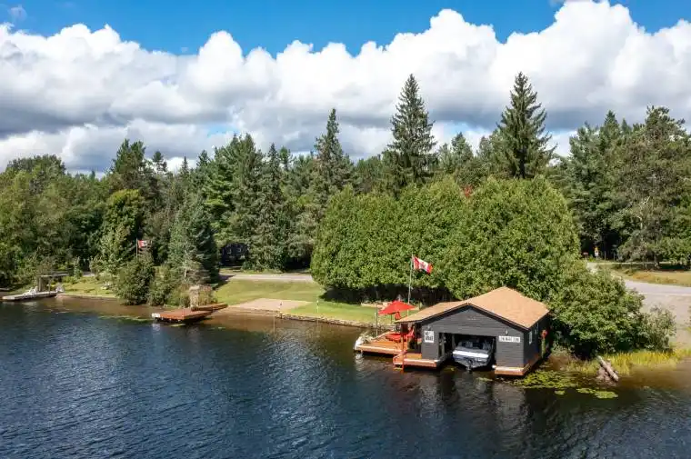 With 150 frontage accessing Lake Muskoka, a grandfathered boathouse, two docks, a fully renovated home and a guest bunkie you literally have everything that you could ever want in a Muskoka property! There is plenty of room for the whole family in a renovated home (1800 sq.ft.)+/- that boasts solid hardwood floors, large custom kitchen, granite counters with high-end appliances, PFA, CA, a stunning original stone wood burning fireplace and a recently renovated large primary suite with large custom walk-in closet, beautiful custom primary bath and walkout to the rear private hot tub retreat. The main 4 piece bath satisfies the needs of the second bedroom as well as any guests. The custom vaulted ceiling with six skylights provides natural light that adds an ambiance often enjoyed while overlooking the waters edge. Additionally the main floor offers an open, bright office. The lower level contains another bedroom, full bathroom, rec room with fireplace and a complete bar as well as an excellent storage room and full laundry room. The guest bunkie can host up to 6 people comfortably, has a 2-piece bath, propane fireplace and AC, so it is excellent for overflow guests year round. The grandfathered boathouse (2010) and two docks are positioned to offer full usage of your frontage that is level with its own beach giving ample room for enjoying every game the family wants to play. The detached oversized (900 sq.ft)+/- double garage has a 3rd garage door to the rear yard for ease of access. The property is fully landscaped and the circular driveway is newly paved. This is a location that is close to town yet just a quick ride to Lake Muskoka for all of the destination boating you could ask for.