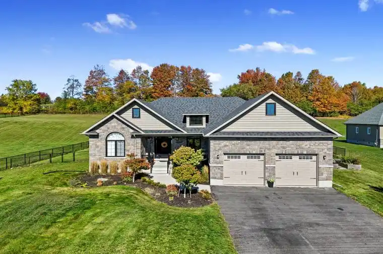 Crafted as the builder’s show home, this stunning property blends elegance and design across 1.28 acres. Designed for entertaining, this home features in-ceiling speakers in the kitchen, living room, and outdoor area, and is wired for sound in the poolside bar, the perfect setting for gatherings both large and small. A covered front porch leads into an open entry where craftsmanship and attention to detail are immediately evident. Throughout the home, 8″ baseboards, high ceilings, and upgraded window and door casements enhance the sense of space and sophistication. The living room impresses with its recessed waffle ceiling, crown moulding, custom built-ins with integrated lighting, and a beautifully detailed fireplace mantel. The open-concept kitchen offers ceiling-height cabinetry, under-cabinet lighting, stainless steel appliances, and large island with breakfast bar. The adjoining dining area features a recessed ceiling, ample room for large gatherings, and a walkout to the backyard. The primary suite offers a tranquil retreat with a tray ceiling, crown moulding, private walkout, walk-in closet, and a luxurious ensuite featuring heated floors, dual vanity with quartz counters, freestanding tub, and glass-enclosed shower. Two additional bright bedrooms and a full bathroom are situated on the opposite side of the home for added privacy. Completing the main level is a powder room, convenient laundry, and access to the double car garage with 13′ ceilings. The lower level expands the living space with a generous rec and media area, built-ins, a games area, guest bedroom, and full bathroom. Step outside to your backyard oasis featuring a fenced yard, sprawling covered deck with added privacy, landscaped patio, inviting inground pool, lounging areas, and stylish pool house with bar and changing area. Ideally located just moments from amenities with easy access to Hwy 401, this property offers modern design, thoughtful details, and resort-inspired living all in one.