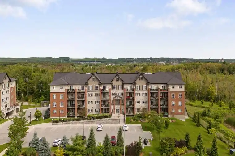 Embrace treetop serenity in one of Barrie’s most picturesque communities. Set within the Ardagh Bluffs and wrapped by the natural beauty of Bear Creek Eco-Park, Greenwich Village is prized for its calm setting, walkable green space, and well-kept buildings. Suite 304 delivers that coveted “bungalow feel without the maintenance” and a rare, unobstructed eco-park view from every window and the oversized covered balcony, and yes, barbecues are permitted! Offering approximately 1,101 sq. ft., this bright, open-concept layout features two generous bedrooms, two full baths, and a seamless living/dining space that extends outdoors for effortless entertaining. Thoughtful interior upgrades include 9′ ceilings that enhance the airy feel, high-end laminate flooring throughout, a custom built fireplace feature wall, and a well-appointed kitchen with modern slab-style cabinetry, Quartz counters, tile backsplash, under-mount double sink, stainless steel appliances (waterline to fridge), and upgraded plumbing fixtures. A compact water softener and in-suite laundry adds day-to-day comfort. The light, neutral bathrooms keep the palette fresh and timeless. Your private primary retreat offers a large walk-in closet and spacious ensuite. The second bedroom is ideal for guests, family, or a dedicated home office with a view. 1 Surface parking and 1 Underground parking with storage locker are included, practical must-haves for year-round living. Being on the third floor positions you level with the canopy, creating a peaceful, elevated outlook that changes beautifully with the seasons. Suite 304 is a hidden gem in one of Barrie’s most desirable low-maintenance communities.