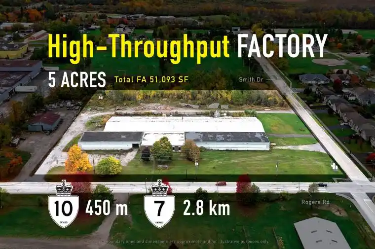 Located at 1847 Rogers Rd in Perth, this 5-acre industrial site delivers +/- 51,093 sq ft (+/- 50,423 sq ft warehouse & +/-670 sq ft office) with two dock-level doors, one drive-in bay, a gravel yard enabling low-friction heavy-vehicle circulation, and ample hydro and natural gas-vacant possession lets you mobilize day one. Fronting the Hwy 7 corridor ~80 km west of Ottawa and ~86 km from Kingston, the property sits on a direct east-west freight route with fast linkage to Hwy 417 toward Ottawa/Montréal and the 416/401 spine to Toronto and the Seaway-an efficient single-campus platform to push throughput, stage trailers, and scale operations.