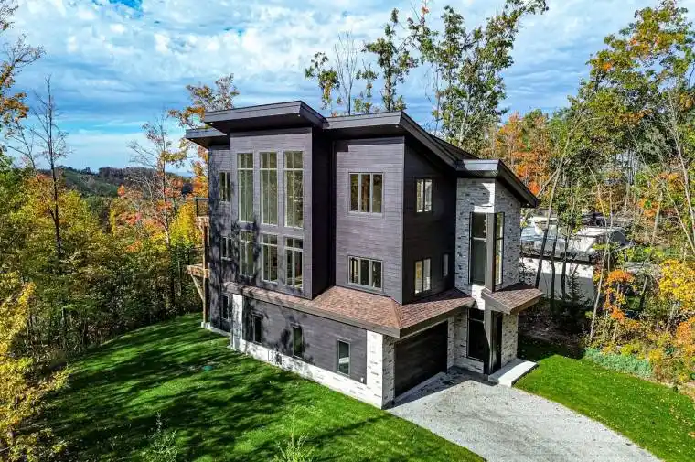 2024-BUILT 4,200+ SQ FT CHALET-STYLE RESIDENCE MEETS FOUR-SEASON ADVENTURE IN HORSESHOE VALLEY! Indulge in the artistry of modern design at this custom-built 2024 home in Horseshoe Valley, capturing panoramic western views and sunsets from its commanding hilltop setting. Boasting over 4,200 sq ft of above-grade living space, this modern chalet showcases striking black Hardie Board siding, stone facade accents, a fibreglass roof, and multiple glass-railed decks designed to celebrate the surrounding scenery. The open-concept main level is ideal for entertaining, highlighted by a 24-ft vaulted ceiling, floor-to-ceiling windows, and a double-sided Napoleon fireplace connecting the great room to the dining/family areas. The gourmet kitchen features Caesarstone quartz countertops, custom two-tone cabinetry, a dramatic X-leg island, a chevron tile backsplash, a pantry, and modern lighting, all flowing to a dining area with built-in shelving and a walkout. A private main-floor office provides a peaceful workspace, while the third level hosts the luxurious primary suite with its own fireplace, balcony, walk-in closet, and spa-inspired ensuite with a freestanding tub, double vanity, and glass shower, along with two additional bedrooms, a full bathroom, and a laundry room. The ground level extends the home’s versatility with 9’9″ ceilings, a bright rec room, an additional bedroom, and a full bathroom. Engineered hardwood, ceramic tile finishes, and meticulous craftsmanship are complemented by superior construction featuring an ICF foundation, LVL beams, and double-studded 2×6 walls. Within walking or golf cart distance to Horseshoe Resort, The Valley Club, tennis courts, and scenic trails, and just minutes to Vetta Nordic Spa, Copeland Forest, Lake Horseshoe, local dining, and Highway 400, this exceptional home is also near a new school, community centre, clinic, and fire station, defining sophisticated four-season living in one of Ontario’s most prestigious destinations.