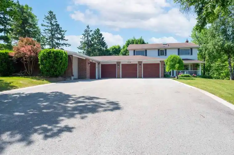 Situated on 2.5 private acres and backing onto a protected greenbelt with mature trees, this home offers tremendous curb appeal among other high-quality residential properties in the area. The 4-bedroom, 4-bathroom residence provides approximately 2,700 sq. ft. of above-grade living space along with a partially finished walk-out basement ready for completion. The property features a long driveway leading to a 5-car garage with an additional carport, as well as a spacious deck overlooking the private, treed setting. A 22′ x 46′ inground saltwater pool is positioned within mature landscaping, creating a peaceful outdoor environment. Inside, the home includes large principal rooms, a functional layout, a gas fireplace, and well-maintained classic finishes, offering a solid foundation for future updates. The walk-out basement provides considerable potential for additional living space, an in-law suite, or recreation areas once completed. This location offers privacy while remaining close to local amenities, schools, and commuter routes, including convenient access to Highway 400, making it suitable for buyers seeking space, flexibility, and long-term value.