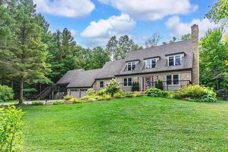 THE PROPERTY THAT TURNS “WHAT IF” INTO “THIS IS IT!” This is the listing that makes every other tab on your browser look boring. Settled on 2 private acres wrapped in mature trees, this home finally gives everyone breathing room, with a walkout basement offering real in-law potential and a loft teens will claim long before they have earned the rent they think they are paying. The brick exterior, dormer windows, long driveway, and landscaping set the tone, leading to a layout filled with warmth and personality. The kitchen could live on Pinterest with wood and white cabinets, a subway tile backsplash, high end appliances including a side-by-side fridge and freezer, and more cabinetry than you will ever run out of, which means your next Homesense run will be less about storage solutions and more about how you want to style your new favourite space. The living room brings charm with French doors and a fireplace, while the family room adds character through exposed beams, another fireplace, and a walkout to a fenced yard with a flagstone patio overlooking the pond and trees. A sunroom wraps you in peaceful views and the main-floor office gives you the quiet zone everyone needs. The second level unfolds into a sitting area that feels made for slow mornings or late-night talks, leading to a primary retreat with an ensuite and additional bedrooms that offer comfortable places to recharge at the end of the day. The walkout basement opens up endless flexibility with a kitchen, rec room, bedroom, den, gym, and bathroom that make multi-gen living feel simple. The loft above the garage elevates the setup with vaulted ceilings, skylights, exposed beams, a private deck, and its own staircase to the yard, ideal for a creative zone, or that friend who always stays longer than planned. Geothermal heating, a triple-wide driveway, an insulated 2 car garage, central vac, and a water softener complete a property that delivers the kind of life people mean when they say they want “more.”