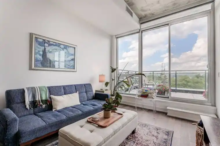 Welcome to The Taylor, a penthouse level loft that blends comfort with modern design. PH 813 features impressive 10 foot exposed concrete ceilings and engineered hardwood floors that add warmth and character throughout. The open concept living and dining area receives excellent natural light and offers an easy layout for both everyday living and entertaining. A standout feature of this home is the generous 130 square foot terrace, providing a private outdoor space where you can enjoy open sky views and a quiet place to unwind. The location is also exceptional. Queen Street East is only steps away, offering access to boutiques, cafes, restaurants and shops, along with convenient transit options. This is a bright, welcoming space in a well maintained building, ideal for those looking for comfort, style and great neighbourhood access. Pictures show furniture from previous resident.