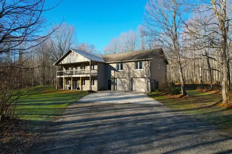 This impressive home in Georgian Bluffs, Ontario, on 2.01 acres, offers a perfect blend of modern amenities and classic charm. The two-story residence features four bedrooms, three bathrooms, including a generously sized primary suite. The home’s entryway is particularly striking, with ornate glass-paneled doors and a distinctive stone floor inlay. The heart of the home is its open concept living area, where the kitchen, dining room, and living room seamlessly flow together. The kitchen is a standout feature with its white cabinetry, stainless steel appliances, and large breakfast bar, perfect for both cooking and entertaining. Hardwood floors run throughout the main living areas, adding warmth and elegance. Large windows and French doors allow natural light to flood the space, while offering views of the surrounding landscape. The bathrooms are well-appointed, one 3pc. with shower on the main floor, a 4pc. bath on the upper level + the primary ensuite featuring a luxurious marble-look walk-in shower. The main floor laundry is conveniently located in the hall, just off the garage. Upstairs you’ll find an amazing bonus-a super large rec room for all ages to enjoy! This multi-purpose room offers a ton of possibilities & is a pleasure to view. The master bedroom is also quite large & features access to upper balcony, as well as a large dream ensuite. Additional features include ceiling fans, recessed lighting, in-floor heating throughout, on demand hot water, central air for cooling, a large, attached garage and a welcoming front porch. The overall design blends modern amenities with touches of rustic charm, creating a comfortable and stylish living environment. Tons of room to kick back in nature and enjoy outdoor living here! Just a short drive to neighbouring towns such as: Owen Sound, Shallow Lake & Wiarton. This is your next dream home!