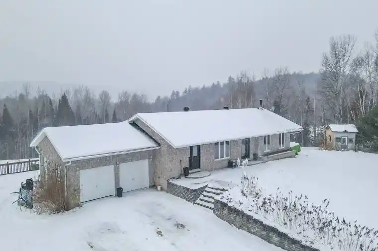 This gorgeous property on just over 6 acres of private land offers breathtaking views of surrounding areas and valleys just outside of quaint and charming Palmer Rapids. This stunning stone home features 3 bedrooms, a partially finished basement, and an attached 2-bay garage. The main level boasts an open layout with a kitchen, powder room, main-level laundry, a cozy living room, and dining area with walkout to a spacious two-tier deck, with glass railings for unobstructed views. Two bedrooms, including a primary suite with an ensuite, complete the level. The lower level offers a rec room with walkout, a third bedroom, a den, plenty of storage, and a roughed-in space ready for a bathroom. Perfectly located near recreational lands, trails and lakes, this property is ideal for outdoor enthusiasts. With its serene setting, lovely landscaping, and modern conveniences, this is the ultimate location for those seeking tranquility and adventure.
