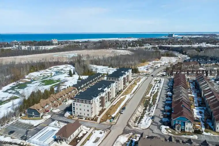 Are you looking for a simple, stress-free place to call home or escape on weekends? This bright and modern condo at The View at Blue Fairway could be just what you need. One of the most affordable homes in the building and perfect for first-time buyers, retirees, or weekend getaways.Step inside the “Eagle” model and enjoy an open layout with tall 9-foot ceilings that make the space feel light and welcoming. The kitchen features granite countertops and stainless steel appliances. With two bedrooms and two full bathrooms, there’s space for guests, family, or visiting friends. The primary bedroom includes a sleek glass shower.Relax on the large, covered balcony with privacy walls on both ends. Fire up the BBQ and enjoy peaceful views of the golf course, executive townhomes, and Blue Mountain.Comfort comes easy here. A heated breezeway and wheelchair ramp make winter days simple, while a climate-controlled elevator adds year-round ease. Enjoy the fitness centre and outdoor pool, plus in-suite laundry, private parking, and an oversized heated storage unit ((8′ x 5.5′ x 9′ tall.)Walk to shops and restaurants at Cranberry Mews, drive five minutes to downtown Collingwood, or head to Blue Mountain Village in under fifteen. Whether you’re starting out, slowing down, or escaping the city, this condo is a place to relax and feel at home.