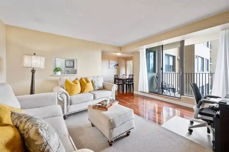2 Parking Spots, All Inclusive Maintenance Fees! Includes: Heat, Hydro, Cable TV, Wifi, Water. Convenient Laundry Ensuite. This 4th floor Unit With Spectacular South East Facing Views, Has an Abundance of Natural Light Sits Perfectly Among Detached and Semi Detached Homes, Giving the Area a Gentle, Suburban Feel. As You Enter the Apartment, You’re Immediately Struck by the Generous Proportions of the Space. At approx. 850 SQF Including Outdoor Balcony, the Apartment is Sprawling, Efficient and Thoughtfully Laid Out, With Laminate Floors Throughout. The Living Room is Wide and Inviting, with Natural Light Thanks to a Large Sliding Door That Leads to a Private Balcony. This Open Concept Design Lends a Natural Flow to the Space, The Large Den is Currently Being Used as a Dining Room. BBQ to Your Heart’s Content on the Balcony, Perfect for Two Chairs & a Small table. The Sizeable Bedroom Conveniently Located for Optimal Privacy, Easily Accommodates a King Size Bed, Double Closets w/ a Semi Ensuite Bath – Its a Personal Retreat From the World, Serene, Still, and Softly Lit. Location is What Sets This Apartment Apart as it Sits Within Walking Trails Among Beautiful and Peaceful Lake Aquitaine. Transit Available Right Outside the Building Connecting w/ GO Train. Book your showing today!