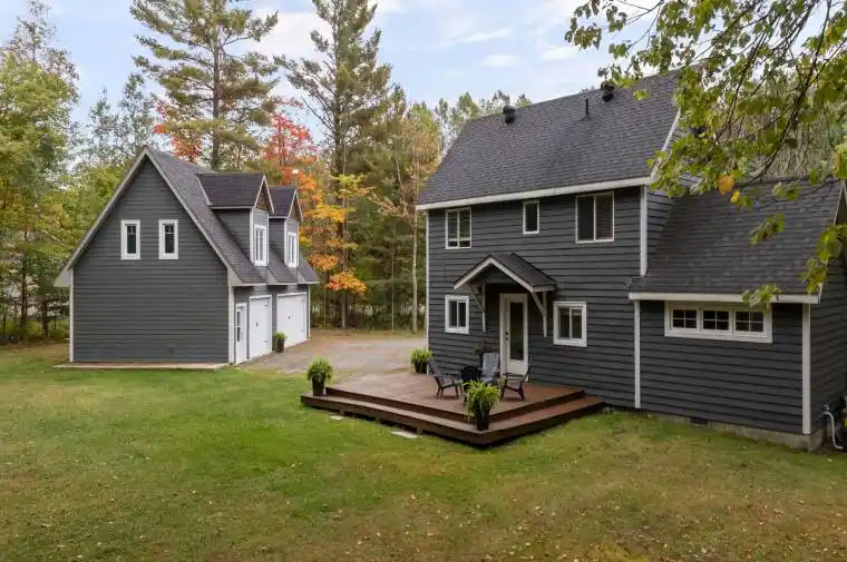 Nestled on a peaceful 0.76 acre, park-like property, this Muskoka retreat blends comfort, charm and quiet serenity. The 1,694 sq ft chalet-inspired home, offers 3 bedrooms and 3 bathrooms, designed for relaxed living and gatherings. Inside the home, a modern rustic atmosphere flows through with wide-plank hardwood floors, exposed beams and thoughtful touches like a classic clawfoot tub. The main floor primary suite feels like a private hideaway with vaulted ceilings a spa like 3 piece ensuite featuring a stone shower, a walk-in closet, all overlooking a large patio. Upstairs the vaulted loft offers a cozy space to relax or entertain accompanied by two additional bedrooms and a full 4 piece bathroom. A rare triple-car detached garage with heated radiant slab flooring and a bright 500 sq. ft. loft above provides endless possibilities – from a studio, gym or office to a future coach house, as services and plumbing rough-ins are already in place. Below, a clean and functional 5′ crawlspace provides storage and houses the home’s services, insulated with spray foam and finished with a concrete floor for durability. Recent updates give peace of mind, including a newer roof (2016), on demand water heater (2018), fresh kitchen counters (2023), a new furnace (2023) along with tasteful cosmetic upgrades that add to the home’s welcoming feel. Located just minutes from town on a paved year-round road, this property offers the best of Muskoka living – tranquil country privacy with all the conveniences of municipal services and high-speed internet. A perfect blend of cozy retreat and everyday comfort, this is a place to slow down, breathe and truly feel at home.