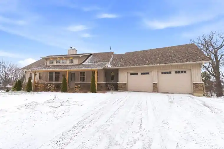 Set on just over half an acre in a quiet lakeside neighbourhood, this exceptional 4-year-old home offers stunning views of Rice Lake and an unparalleled indoor/outdoor lifestyle. A public dock and boat launch are conveniently located within 200 metres, making this an ideal property for boating and lake enthusiasts.Designed with a unique, sun-filled open-concept layout, the home offers approximately 2,400 sq ft of finished living space with 9′ ceilings throughout and a dramatic 15′ vaulted ceiling on the main floor. At the heart of the home is a massive central stone fireplace, complemented by a propane fireplace on the main level and a wood-burning fireplace in the lower level, creating warmth and character year-round.The main floor features a spacious primary bedroom with a private covered porch, a beautifully appointed ensuite, main floor laundry, and abundant storage and closet space. The finished walk out lower level offers two large bedrooms, a full bath, and additional living space ideal for family or guests. Hardwood and ceramic flooring flow throughout the home, adding timeless style and durability.Built for comfort and efficiency, the home boasts super-insulated walls and ceilings, in-floor hydronic heating on all levels, and a propane boiler providing both heat and hot water. Three mini-split units offer supplemental heating and air conditioning.Car, hobby, and recreational enthusiasts will appreciate the oversized four-car over/under garage, complete with a 9,000 lb Atlas two-post hoist, in-floor heat in the lower garage, propane radiant heat in the upper garage, air compressor plumbing on both levels, welder plug, RV hookups, and extensive storage for cars, boats, and campers.With covered front and rear porches, breathtaking lake views, and thoughtfully designed spaces throughout, this remarkable property offers comfort, functionality, and a lifestyle rarely found.