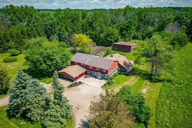 Here is an opportunity to own and live in a piece of rural delight. Enjoy 12 acres on a paved road with 8 acres of nice, mature forest, set around a modern, 5,200 square foot house. The 6 bedroom, 2.5 bath home with updated kitchen has a sunroom, family room, den, living room and an insulated 2 car garage. Enjoy your own country property with trimmed trails and 3 ponds in the hardwood bush. There is a small cabin in the corner of the property for your own staycation. The 40 X 47 horse barn is attached to a fenced grazing area in view from the house. An additional feature to this retreat is a new (2023) open span steel structure that is 130 X 60 ft. with 17 foot walls. It is currently used as a riding arena but has potential for many other purposes (repair shop, manufacturing, etc.) with its own road entrance. Updates include the roof which was replaced with 50 year shingles, eavestroughing, some new windows, UV, RO, water softener in 2022, furnace in 2025. Perfect for a hobby farm, home business, multi-generational living, or simply enjoying the peace and charm of country living.