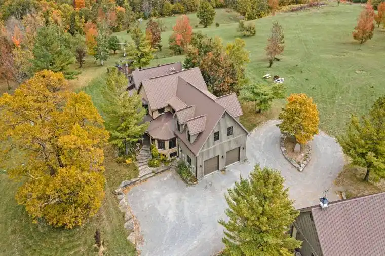 A breathtaking property! The ultimate in privacy and serenity! This unique and elegant home offers incredible views from each room, with over 6,800 square feet of living space. High ceilings; built-in speakers throughout; high-end trim work; large, stately rooms; lovely landscaping with flagstone patio and walkways. Live off the land with your very own veggie and herb gardens, maple syrup, fruits from the orchard and fresh eggs; approximately 30 acres with walking trails. You can live off grid by simply adding solar panels. Recently added boiler/heat exchanger heats entire home with wood. Propane available as back-up. 2+ car garage with oversized doors and radiant floor heating is attached to home. Another detached 2 car garage plus garden shed with chicken coop, plus a third, detached 3+ car garage/workshop with radiant floor heating and ICF construction. Metal roof on all buildings. Less than 30 min to Hwy 407. If you are looking for something absolutely unique and one-of-a kind, your search ends here!