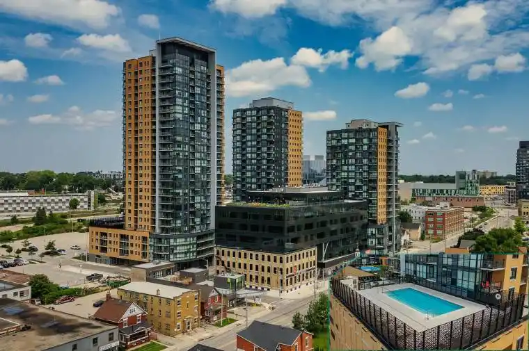 Discover one of the most desirable buildings in the city at Garment Condos! This spacious and well-designed unit offers exceptional value with a bright, open-concept layout and modern finishes throughout. The contemporary kitchen features sleek cabinetry, a convenient breakfast bar, and premium flooring that flows seamlessly into the living space. A generously sized bedroom, stylish 4-piece bathroom, in-suite laundry, and private balcony complete this comfortable and inviting home. Residents enjoy outstanding building amenities including a rooftop pool, fitness centre, party room, lounge area, yoga space, pet run, urban park, and sport court. Perfectly situated in the heart of Downtown Kitchener, just steps from Google, KPMG, Deloitte, the LRT hub, GO Train, Communitech, the Schools of Pharmacy and Medicine, Victoria Park, and an endless selection of shops, restaurants, and entertainment. A bright, modern condo in an unbeatable location-don’t miss this opportunity!