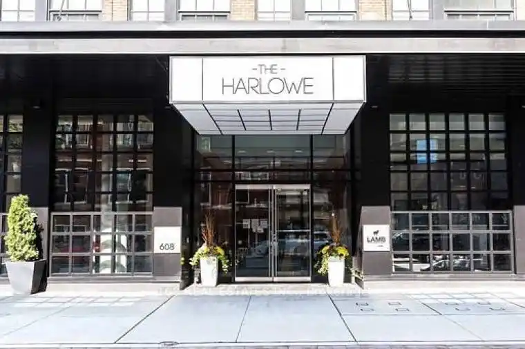 Welcome To The Harlowe! Fantastic One Bedrm + Den. Quality Modern Features & Finishes Include Stainless Steel Appliances, Exposed 9 Feet Concrete Feature Walls & Ceiling, Stone Surface Counters, Engineered Wood Flooring, Floor-To-Ceiling Windows & More. Unbeatable Location Just Off Queen Street West Strip. Walk Out From Living Room To Balcony With Bbq Hookup! Large Windows Let In Tons Of Light. Shopping, Restaurants, Bars King/Queen Street Transit.