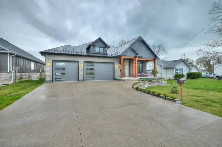 Amazing home in Excellent location near the QEW, Shopping and US border. 3 + 2 bedroom Bungalow finished top to bottom. This home has MANY upgrades you will not find in homes at this price point. Lifetime diamond shape metal roof, ICF foundation, 3 car insulated garage, separate walk out to basement, huge covered rear deck. 9 ft ceilings on main floor, 10 ft tray ceilings in LR & DR. 9 ft basement height. Engineered hardwood throughout main level. 46 inch linear gas fireplace, Quartz Double waterfall edge on oversized kitchen island, glass wine display, 12 ft double sliding patio door to covered porch. 4 zone sound system, 7 camera security system, fully finished basement with 2 addition bedrooms, 5 piece bath and huge rec room w/ gas fireplace. Primary ensuite and basement bathroom have heated flooring. Outdoor wooden Sauna is included. 4 years remaining on Tarion warranty. Quartz countertops in all bathrooms. Newly finished concrete/aggregate driveway. Beautiful home, you will NOT find another like this one. **Listing agent is related to sellers. Purchase price shall include a 10.01 m x 12.19 m parcel at the rear of property
