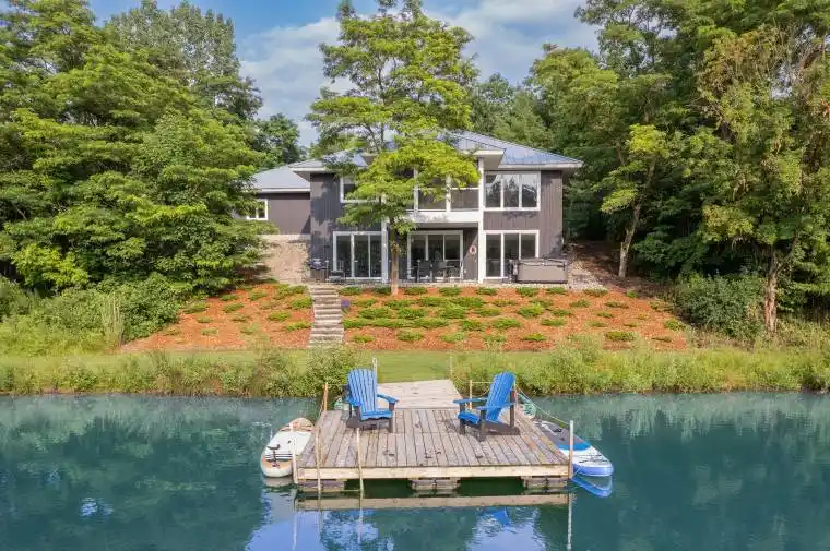 MUSKOKA IN GRAND BEND | WATERFRONT ON PRIVATE LAKE w/ SPECTACULAR VIEWS | FULLY FURNISHED TURNKEY PACAKAGE | STEPS TO SANDY BEACH ACCESS: Welcome to Wee Lake, Grand Bend’s best kept secret featuring a crystal clear sparkling blue spring fed private lake for swimming, paddle boarding, fishing & kayaking + stellar skating & family hockey in the winter + access to the Ausable River for even better fishing! Fall in love with this young custom 4 bed/4bath walk-out bungalow, one of only 5 lakefront properties nestled into this secluded subdivision, which is a small & quiet single cul de sac community on the beachside of the HWY. With only 36 parcels total & lake access limited to Wee Lake residents (sharing 1/36 ownership of lake), this tranquil & peaceful naturally fed sparkling phenomenon is barely used. This stunning architecturally designed custom masterpiece fronts the lake w/ 134′ of priceless linear water frontage. Providing exceptional main floor living framing-in nonstop lake views + a sprawling lower level walking out to your included hot tub & swimming/fishing dock just 50 ft from your poured concrete patio, this is a 10+! The layout is brilliant, w/ soaring main level ceilings inc. an impressive 20+ ft vault & 10 ft ceilings throughout rest of main, a stellar master suite w/ ensuite/walk-in, laundry w/ sink + 2nd laundry in lower, 2 more main level bedrooms (one w/ a 1/2 bath ensuite/ ideal for home office), 2 sunrooms (guest sleepers), 2 gas fireplaces, lower level walk-out w/ bed & full bath + wall to wall windows – simply perfect. Imagine sipping your morning coffee while the kids or grandkids swim off your private dock w/ the dogs enjoying their fenced in yard / dog run. As an ideal family get away, short term rental money maker, or principal residence in the booming beach town of Grand Bend, this is a winner, just to steps to one of our most secluded area beach access points, the Pinedale Rd beach path. Turnkey package including furniture & appliances!